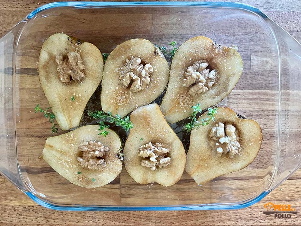 Baked pears are a simple and refined dessert, perfect when you desire something wholesome yet with a special touch. Just a few ingredients – a bit of brown sugar, a pinch of cinnamon (and ginger if you like), some crunchy walnuts, and a sprig of lemon thyme – can transform simple pears into a delicious and light dessert. They are prepared in just a few minutes, and while they bake, they fill the kitchen with an irresistible aroma. They are perfect to enjoy on their own or with a scoop of vanilla ice cream to make even the simplest evening special.