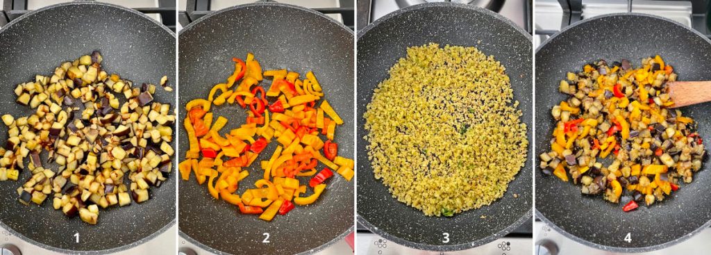 • Wash the eggplant and cut it into cubes. Heat a large pan with a drizzle of extra virgin olive oil, add the eggplants, season with salt, and cook over high heat for a few minutes until the cubes are tender and browned on the outside (1).