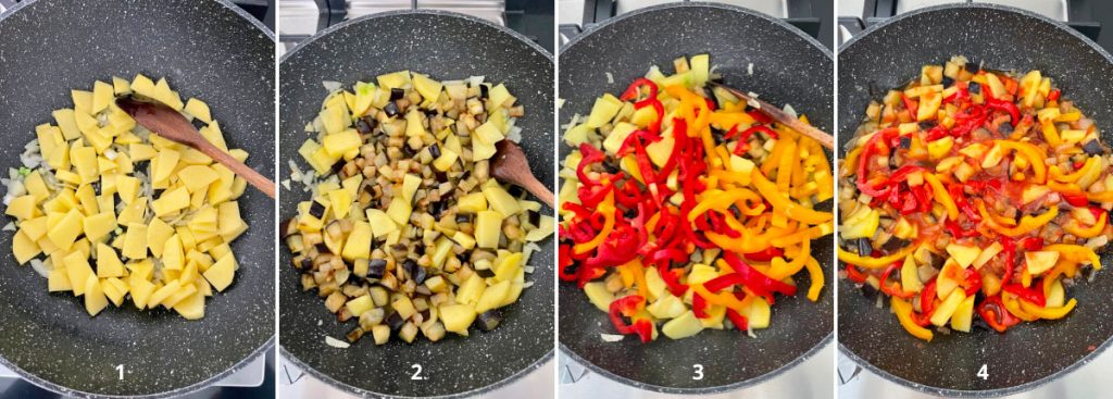 Sauté for a few minutes, then add the eggplants, previously cut into cubes (2), and salt.