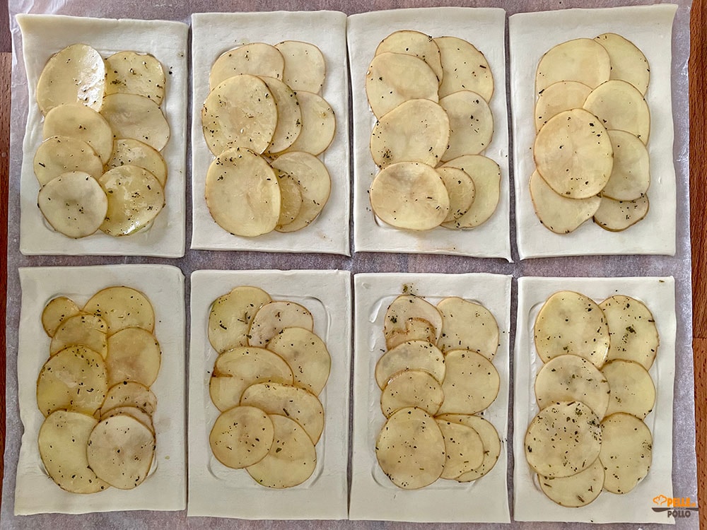 The potato slices must be very thin, otherwise they won’t cook in the oven. If you can’t slice them thinly and evenly, I recommend boiling them for a few minutes in salted water before placing them on the pastry.