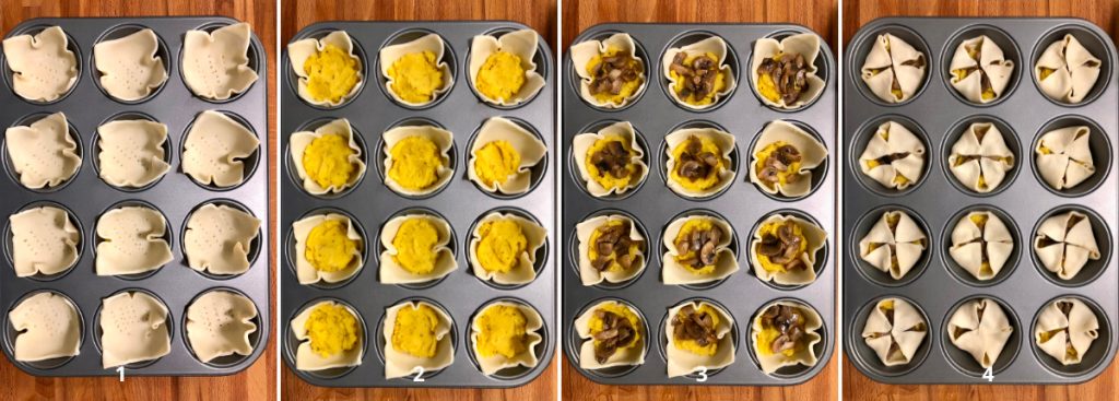 Distribute the potato mixture inside the squares (2) and then add the mushrooms (3).