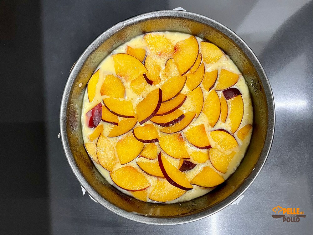 Line the cake pan with parchment paper, or grease and flour it. Pour in the batter and level it, then arrange the remaining peaches on top.
