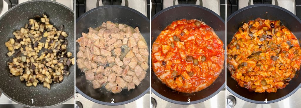 When the bites are almost cooked, add the eggplants in cubes (4).