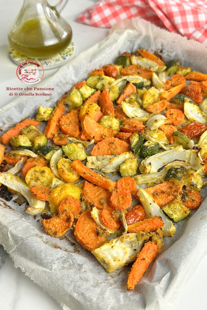 • Prepare the sweet potato as well, peeled, halved, and sliced. Prepare the fennel, washed and cut in half, then into slices and wedges. Also cut a zucchini into cubes, put all the vegetables together, season with oil, salt, curry, rosemary, and oregano, and mix. Add breadcrumbs and parmesan, mix well, and pour onto the baking sheet lined with parchment paper. I actually preferred to use 2 smaller trays, in one I put most of the vegetables, the others in a second tray where I left space in the center for the cod, but a large baking sheet works fine for everything.