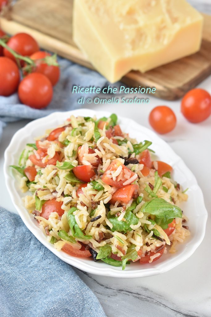 Add the cherry tomatoes, arugula, Parmesan, and some finely chopped olives to the cold rice, mix well, and let it flavor and cool in the fridge before serving. Adjust to taste if you want to add more oil and salt.