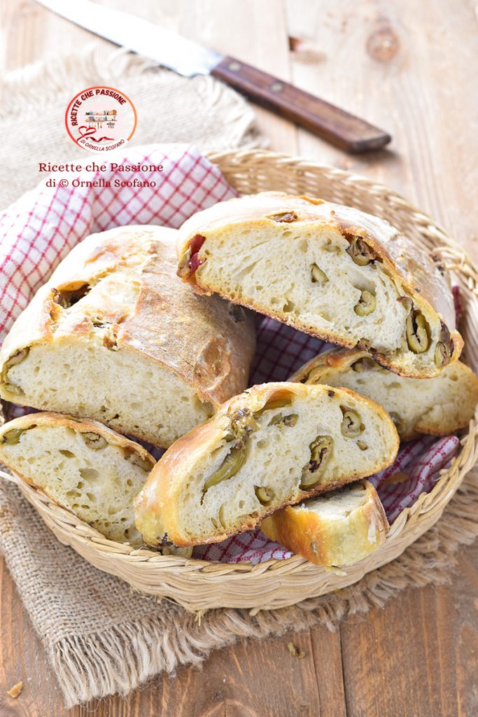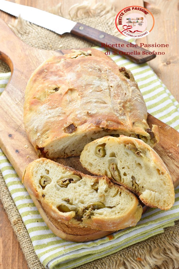 I’m back with a lovely sourdough recipe: semolina bread with crushed Calabrian olives made with sourdough starter. Alternatively, if you don’t have fresh sourdough starter you can use dried starter from a packet. I love making bread at home and I occasionally try new variations. This time I prepared a mixed semolina of re-milled durum wheat, adding homemade crushed olives that have a unique taste and flavor. Some time ago I made small baguettes, which were also delicious and perfect for aperitivo, great on their own. This time I made two large loaves to replace the usual bread at lunch and dinner with this fragrant and tasty olive bread, and the result is truly exceptional, enhanced by the use of sourdough starter which allows a natural rise that makes the bread really special — just like the one from your favorite baker.