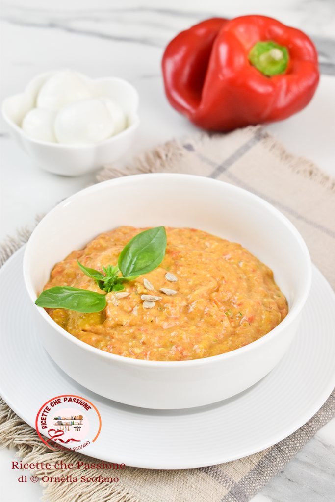 Let’s see how to prepare this delicious roasted pepper cream with buffalo mozzarella and basil.
