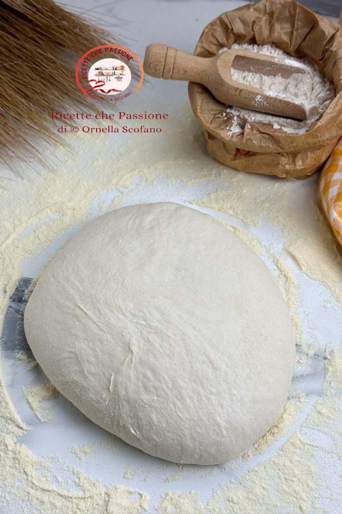 • We prepare the dough at least 5 hours in advance. If before, even better. In a bowl, dissolve the yeast in water and then add the type 0 flour and mix with the spoon. Add a little semolina, the salt, and continue mixing well with the spoon. Then add the rest of the flour and when the dough becomes more solid, knead by hand. Finally, add the oil and work the dough to incorporate it completely. Knead well and place it back in the bowl, cover with cling film, and let it rise. For a warm rise at about 82°F, it takes about 4 hours. I do it in the oven with a pot of hot water and the light on. For lower temperatures, the times are longer.