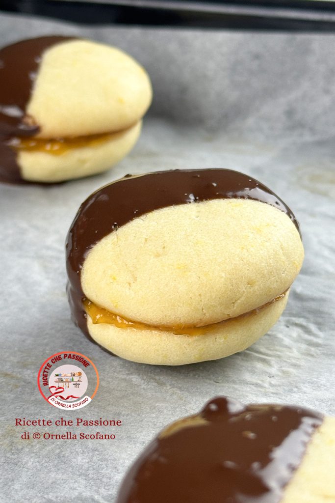 Calabrian lady’s kisses, delicious butter cookies paired with a layer of delicious filling, apricot jam, buttercream, or more indulgent flavors like Nutella, pistachio cream, or strawberry cream. For my first home try, I chose to fill them with simple apricot jam, which is the flavor I prefer, on the outside covered halfway with dark chocolate. These lady’s kisses are not the traditional ones with hazelnut dough, but they are larger cookies typical of Calabria, created in the Lametino area, where they are never missing from any pastry shop. There are similar ones to those I propose, but also in a larger cookie version, slightly thinner, about 4 inches in diameter. I tried to recreate the classic and most widespread version, but I won’t hide from you that the original recipe is not unique, in fact, each pastry shop has its own, and depending on where you eat it, the taste and texture of the cookie change. Sometimes the dough is harder, other times more melt-in-the-mouth, the taste can vary, with vanilla or orange, lemon aroma, as well as the filling and the coating change, with dark, white, or colored chocolate depending on the cream used to fill it. I have prepared a nice substantial version, those that melt in your mouth with a good Bavarian butter dough. Prepare them with me, at Christmas they cannot be missing, I would take you to see the wonder that is in our pastry shops during this period in view of Christmas, it looks like a jewelry store shining with colorful Calabrian lady’s kisses, better than diamonds.