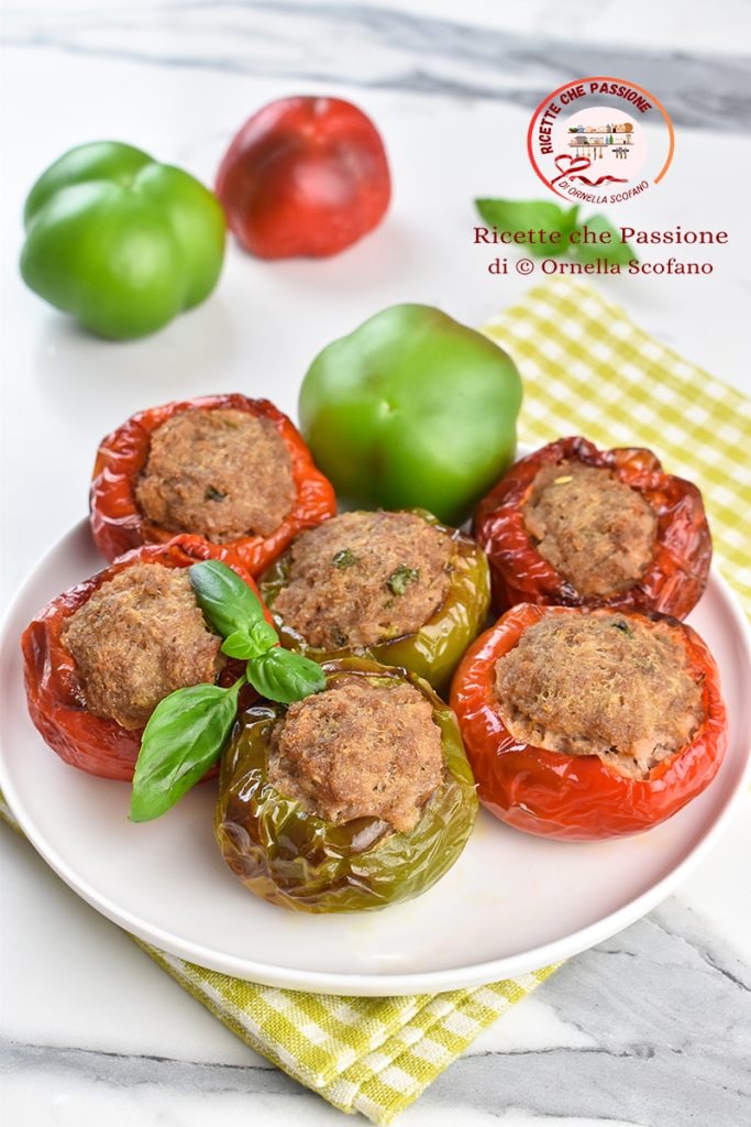 • Sprinkle the inside of each pepper with a little fine salt and then stuff with the meatball mix prepared and left to rest in the meantime, covered with cling film, in the fridge.