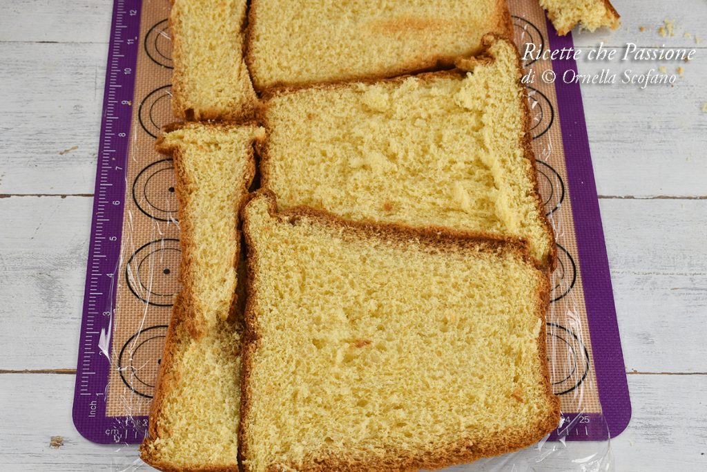 Cut the pandoro in half, and from one half, cut 4 slices slightly over half an inch thick. Arrange them on a sheet of plastic wrap, fitting them together to form a rectangle, as in the photo.