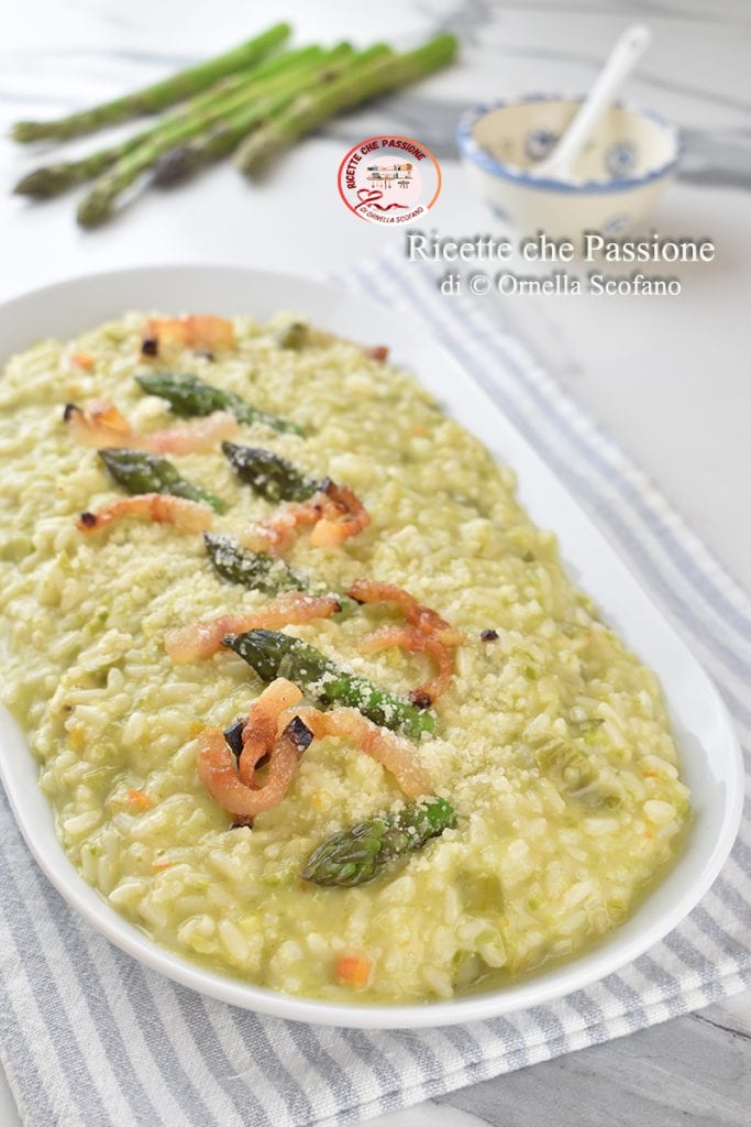 If you want, you can also blend all the asparagus to make the asparagus risotto even creamier, even though it’s already very creamy. For 4 people, just double the quantities. You can also replace the bacon with shrimp.