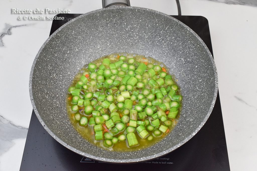 Next, add the rice to the pan when the broth has completely dried, let it toast, then deglaze with white wine, allowing it to dry well, and gradually add the broth needed to cook our asparagus risotto.