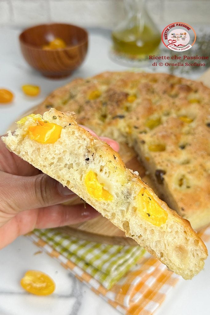 Steps to prepare focaccia with yellow cherry tomatoes and olives