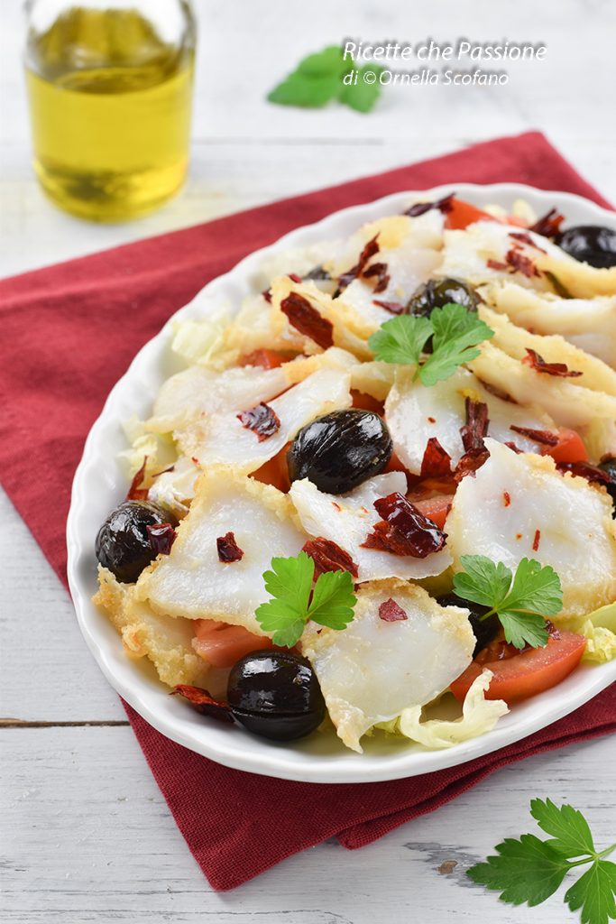 Fried salted cod salad, the perfect appetizer to bring to the table at Christmas, rich in flavor and easy to prepare Calabrian style. As per tradition, fried salted cod cannot be missing; I don’t know about you, but in Calabria, it’s a great classic. It often happens that it is served as a second course, but after the appetizer buffet, it happens that no one touches it because they are already full, so I thought of 2 options: either prepare it as an appetizer, in a delicious cold salad, or use it for the next meal to prepare the salad if there’s any left. So, we have the double option; I honestly prefer the first one, prepare a smaller amount, and it will certainly be more appreciated with a nice buffet rich in mixed seafood appetizers, as is tradition here in Calabria for Christmas Eve, where a banquet with at least 13 courses is expected, just like the number of diners at Jesus’ last supper.