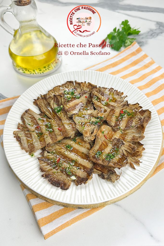 How delicious grilled marinated oyster mushrooms are, quick to prepare, and they keep in the fridge for a few days thanks to the marinade with oil and vinegar, making them really very pleasant, with a fresh and enjoyable taste that suits this meaty mushroom with a sweet and delicate taste. Oyster mushrooms can also be grown at home like cardoncelli mushrooms, belonging to the same family. In fact, I did it some time ago, I had bought a couple of mushroom bales, one of cardoncelli, and the other of pleurotus. I love them both, and since I cook them often, I thought, why not try growing them, since they are ready for harvest, you just need to water the bales and wait for the harvest. I’ll leave you the links if you want to try home cultivation too.