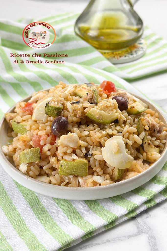 With the arrival of the heat, the desire for cold dishes is great, and since zucchinis grow abundantly during this period, we can’t help but eat them often. To serve them differently, I thought of pairing them with a fresh grilled zucchini rice salad and lots of goodness for a complete dish for the whole family. I also added hard-boiled eggs, tuna in olive oil, some cherry tomatoes, and olives to make it even tastier, but you can also add basil pesto or your favorite ingredients. Just a bit of extra virgin olive oil is enough for dressing, but if you can’t do without it, a tablespoon of mayonnaise is always allowed. Here are more ideas for cold dishes on beautiful days.