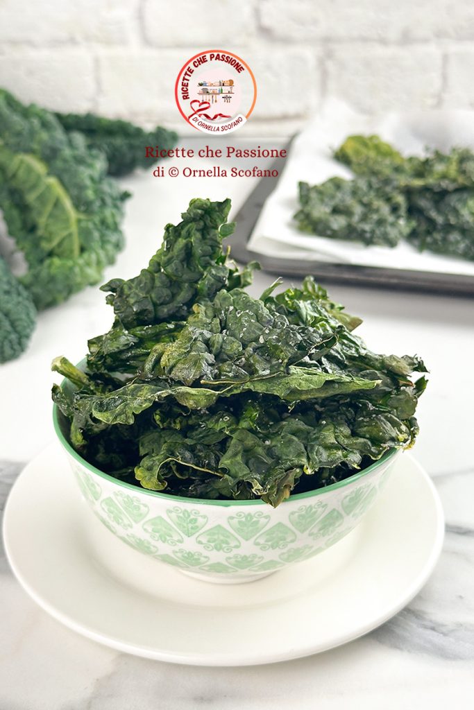 Kale is a typical winter vegetable from Tuscany, but finally, in recent times, I can find it here in Calabria too, so every time I find it, I bring it home to make tasty recipes. Since this time I got 2 nice bunches, I had some left over that I thought of baking to make delicious crispy chips. Prepared this way, kale becomes a tasty, light, and delicious snack with a good cabbage flavor and crunchiness. It can also be used to enrich other recipes, for example, today I tried it crumbled in my pasta and beans, you won’t believe it, but it was perfect, so much so that I crumbled quite a bit more into it. If you want to try it too, here’s the easy and quick recipe; I’ll also give you other ideas for cooking kale.