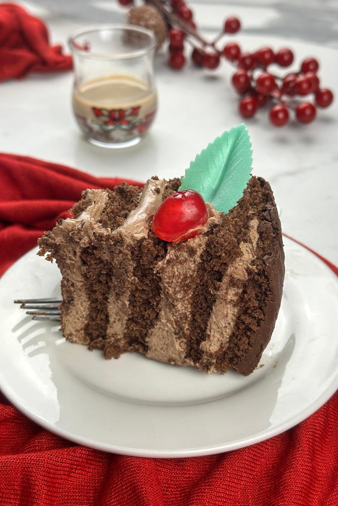 Decorate with candied cherries and wafer paper leaves. Keep in the fridge for a few hours before serving, so it sets well.