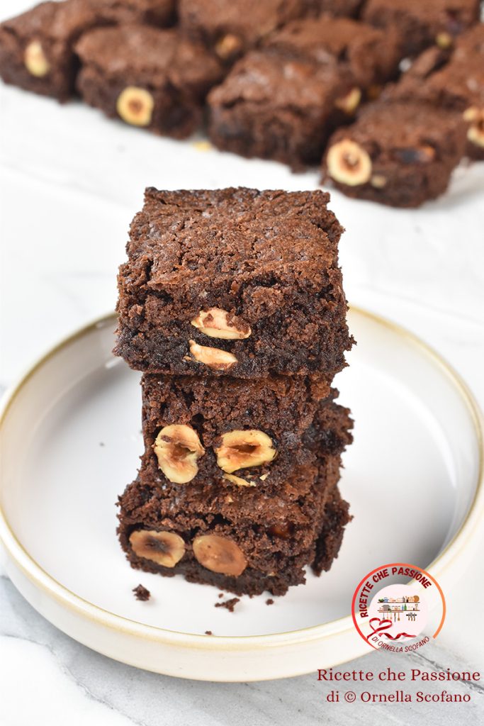 Dark chocolate brownies with hazelnuts, a delicious chocolate treat of American origin. In American bakeries, they are found in every display, and for a few years now they have also become popular here. I loved them at first bite, a few decades ago now, but it had been a long time since I last made them. On the occasion of my nieces’ visit, I decided to make them again to offer them a chocolate treat as I know how much they love chocolate desserts. Brownies are chocolate treats with a soft center and a thin, slightly caramelized crust, truly a delight for the palate. If you love chocolate, you can’t miss them. I prepared them with hazelnuts as per the classic recipe, but they can also be made without, or you can substitute with other nuts.