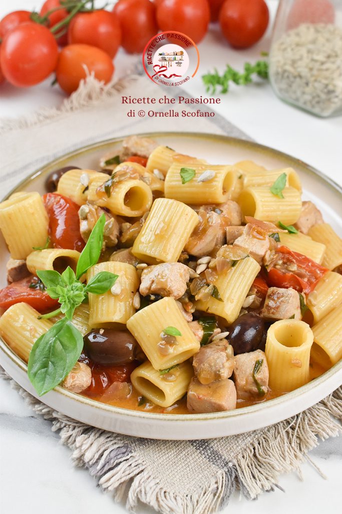 Cut the tuna into cubes and put it in the pan, let it brown and deglaze with white wine and let it dry on high heat, do not let it cook too long, now add the olives. Finally, turn off the heat and add basil and salt if needed.