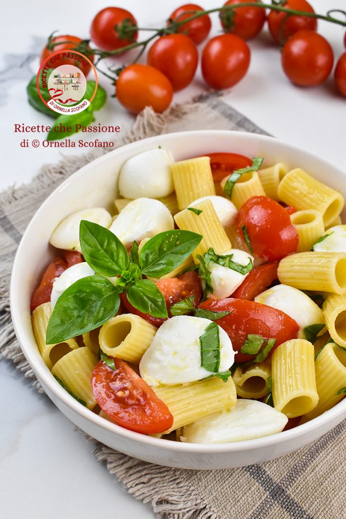 A delicious Caprese pasta salad, cold pasta to enjoy on hot days, quick and light, very easy to prepare, with just the pasta to cook, make sure it’s al dente, or as per personal taste. The Caprese pasta is made with a few ingredients, and as you might have guessed from the name, Caprese, it’s made with the ingredients of the Caprese salad, mozzarella, tomato, and basil, dressed with good extra virgin olive oil. In summer, you never feel like spending much time at the stove, and when the heat is unbearable, it’s ideal to cook during the cooler hours, prepare everything in advance, and then enjoy delightful cold dishes that are also more pleasant and light, and very easy to prepare, also great to take to work or maybe to the beach. So let’s see how to prepare cold Caprese pasta. Here you can find other delicious cold pasta recipes, in summer also excellent are rice salads, or legume salads, potato salads.