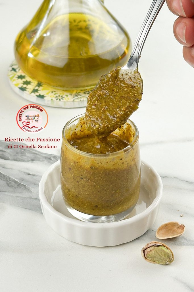Quick homemade pistachio pesto perfect to enrich holiday dishes, great with pasta, with meat and fish main courses, to enhance our crostini, in short, it goes well with everything and I honestly love it. I always bought it ready in a jar, but then I wanted to try making it at home, developing this very quick recipe, which involves the use of salted pistachios, the ones we commonly buy to snack on after meals during the holidays. I love pistachios too much and even though they are expensive, they cannot be missed at Christmas, so here I am trying to make pesto, quick, delicious, maybe it won’t be beautiful or perfectly green, but it’s amazingly tasty, and also very quick.