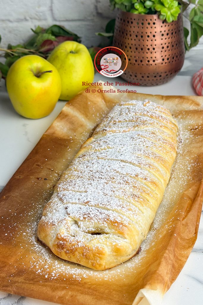 Close with the first flap of empty pastry, then before closing with the other, make parallel cuts, about 3/4 inch apart, starting from about 3/4 inch from the filling towards the outside, as seen better in the video. Lifting the pastry strips with the parchment paper, close to form a strudel. Seal well at the two ends.