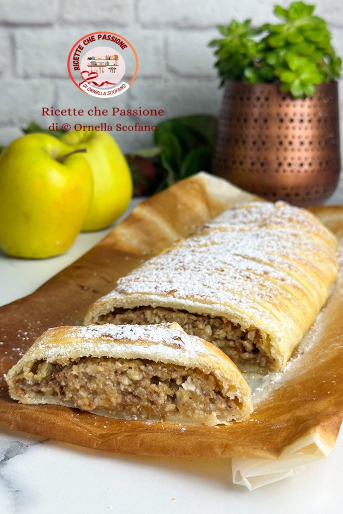Quick Puff Pastry Strudel with Apples, Almonds, and Amaretti, a quick dessert to satisfy that sudden sweet craving, great as a dessert after a meal or if you prefer for breakfast, with a rich filling of blended apples with almonds and added amaretti that make the filling more delicious. Instead of amaretti, you can use flour to better bind the filling mixture, or you can use breadcrumbs or other types of crumbled biscuits, as you always need a drier ingredient to eliminate the excessive moisture of raw apples. Instead of puff pastry, you can also quickly prepare a good homemade shortcrust pastry, with butter and let it rest a bit or with extra virgin olive oil and worked immediately to prepare the dessert, I chose to use the puff pastry I had in the fridge, which was about to expire, so I avoided waste and made myself a very quick dessert. The filling is a granular mix obtained by blending almonds and apples together, first the apples and then adding the almonds later to not reduce them to flour.