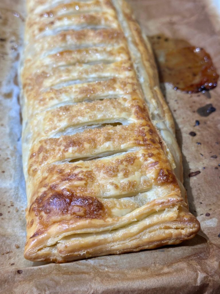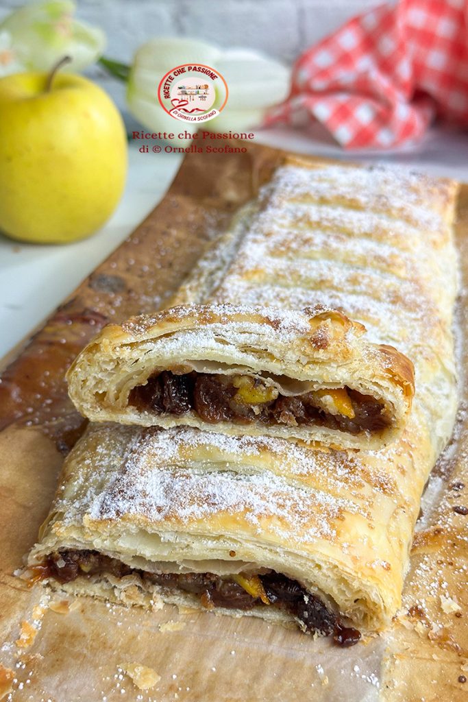 Quick puff pastry strudel filled with apples, walnuts, raisins, cinnamon, orange marmalade, and amaretti, resulting in a delicious dessert, very simple to prepare with a well-bound filling. I chose golden apples for my strudel, they were already very good raw but I decided to sauté them first in a pan with half a teaspoon of cinnamon. I didn’t cook them too much, just about 3-4 minutes, just enough to soften them a little. I then added all the other ingredients to the apples to prepare the filling and wrapped everything in the ready-made puff pastry, alternatively a good homemade shortcrust, or you can use the puff pastry base I use for croissants. So I would say it’s time to head to the kitchen, the quick puff pastry strudel is waiting for us!