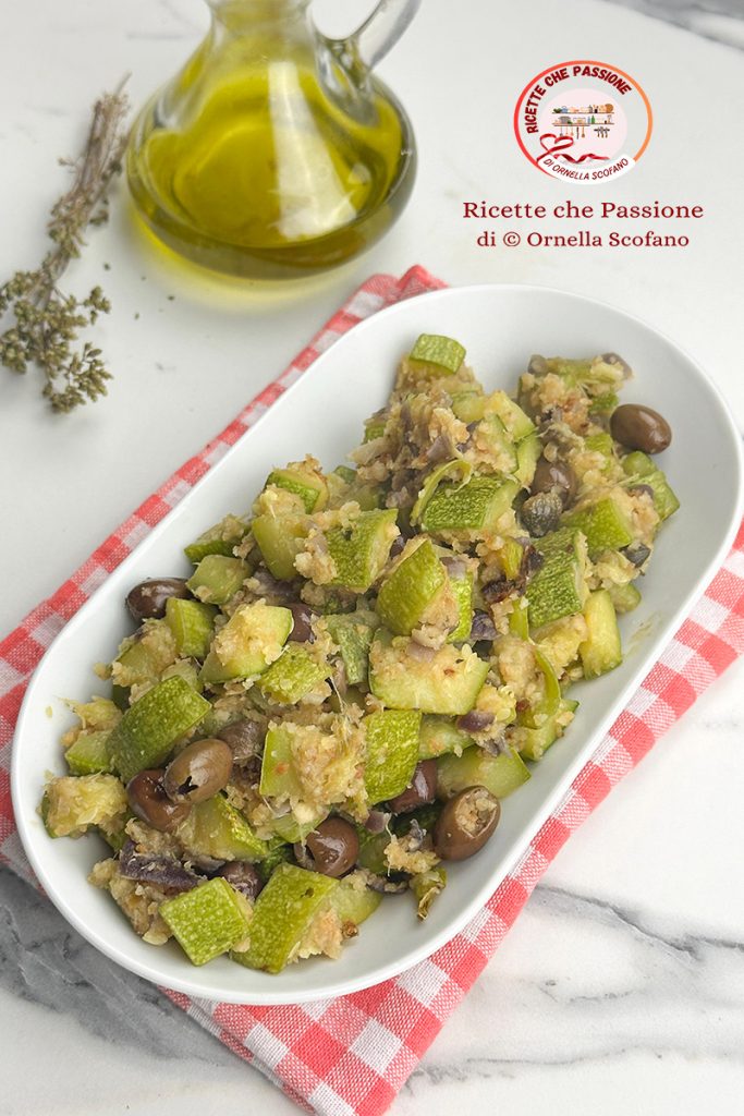 Delicious and quick side dish, stir-fried zucchini with breadcrumbs, olives, and capers, tasty and flavorful with onion and oregano, a good main dish for a light dinner or as a side for meat or fish. A light dish with zucchini, quickly cooked in a skillet, light with just one tablespoon of extra virgin olive oil for 2 people, quickly stewed in a skillet with a lid. If you’re in the mood for something a bit different with zucchini, try this quick stir-fried zucchini with breadcrumbs; it takes just a few minutes and is delicious. You can find this recipe in the zucchini recipe collection. If you also love this seasonal vegetable, typical of spring and summer, make sure you don’t miss any. You’ll find many tasty ideas for cooking zucchini, and here are some of the recipes I love to prepare most often with zucchini.