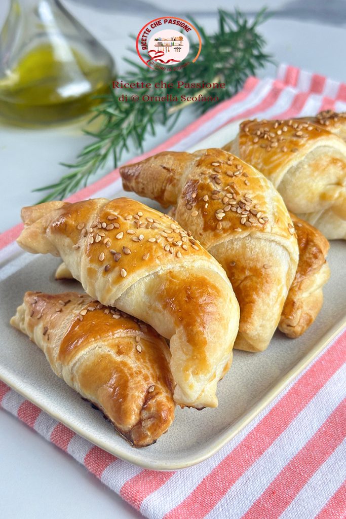 These filled puff pastry croissants are delicious served hot, so keep them ready and bake at the last moment, but they are also good cold, so you can choose to bake them a bit in advance too. If necessary, they can also be frozen before baking, if using fresh sausage.
