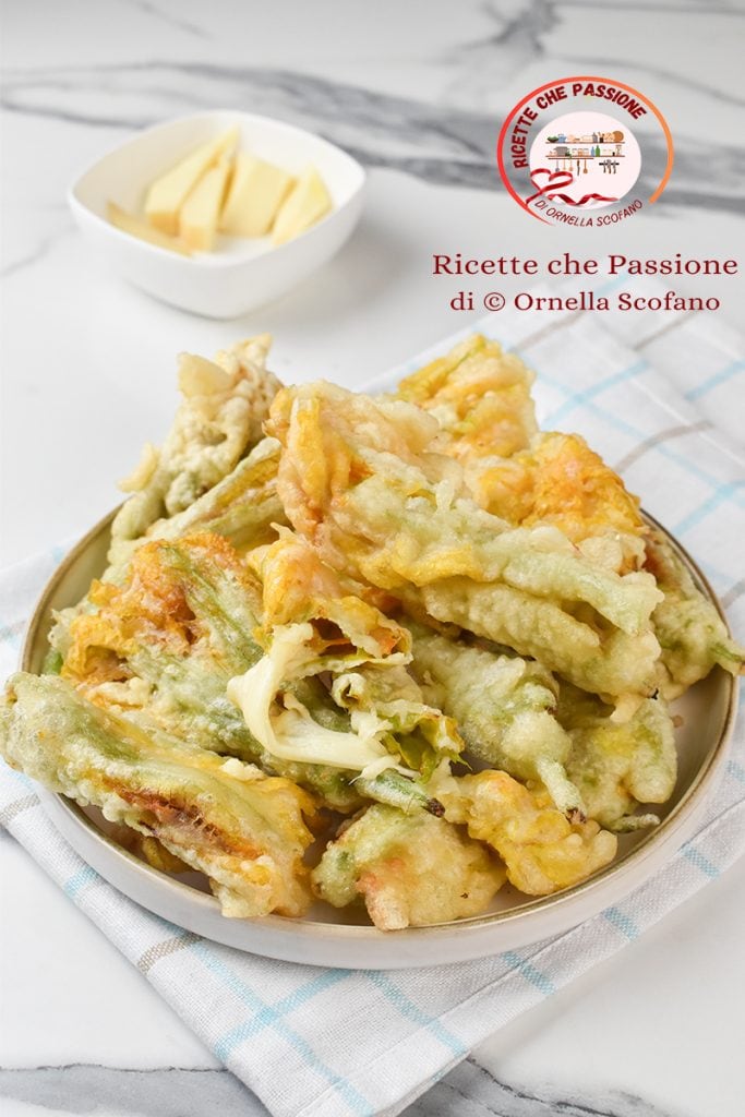 Stuffed zucchini flowers in golden, crispy fried batter, with a melty heart of smoked provolone and anchovies, truly delicious for an appetizer or aperitif paired with fresh bubbly that suits this dish well. Zucchini flowers are delicious fried, but if you prepare them stuffed, they are even better, so why not take advantage of the fact that they are in season now? Yes, the peak season is spring to early summer, but with the arrival of late summer rains, the garden comes alive again, and the zucchini plants generously provide flowers, so let’s not waste any and enjoy them in delightful recipes.
