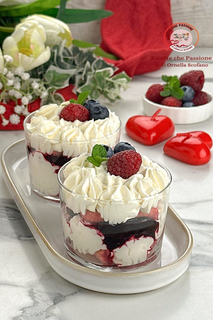 Valentine’s Day mixed berry tiramisu cups, delicious single-serving dessert with mixed berries, ladyfingers soaked in Alchermes, and quick eggless mascarpone cream. A sweet treat to enjoy on the most romantic and sweetest day of the year, but so good and easy to make all year round, a sort of quick mixed berry tiramisu. I made this treat a few days ago, I had some leftover mascarpone cream, and to avoid wasting it, I decided to prepare these cups. Whether it’s Valentine’s Day or another occasion, it doesn’t matter; they are really delicious and quick to make, and they always impress. Here are some more delicious ideas for Valentine’s Day.