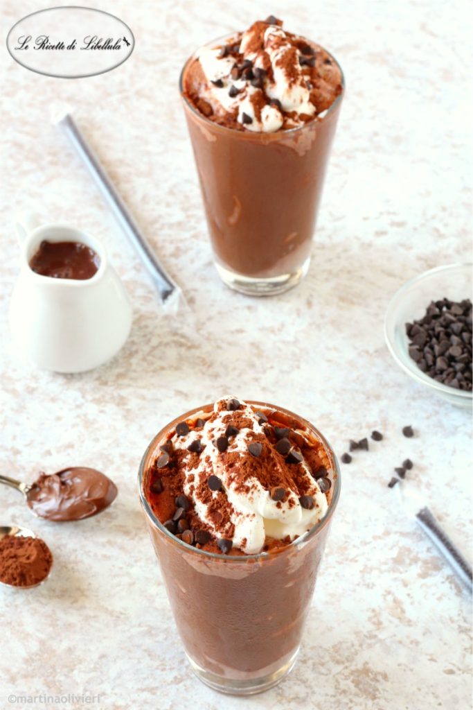 The chocolate milkshake is a fresh and tasty drink that can be made in a few minutes. I made the chocolate milkshake using three ingredients: chocolate milk (in this case, I used rice chocolate milk, but you can use any chocolate milk you prefer), vanilla ice cream, and unsweetened cocoa. I then served the milkshake garnished with whipped cream and chocolate chips; moreover, before pouring the milkshake, I “smeared” the inside of the glasses with hazelnut cream. Perfect as a snack or dessert, this chocolate milkshake is perfect for chocolate and ice cream lovers.