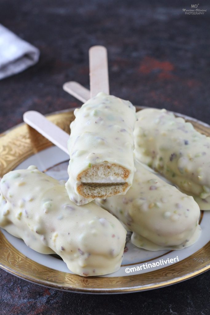 The mini ice cream bars with pistachio and white chocolate are tasty single-serving desserts that are easy to make. These mini ice creams are made by filling two Pavesini cookies with mascarpone cream and pistachio spread, then joined with a stick and dipped in milk; finally, coated with white chocolate and crushed pistachios. For a refreshing and sweet break, these mini ice creams will delight both kids and adults!