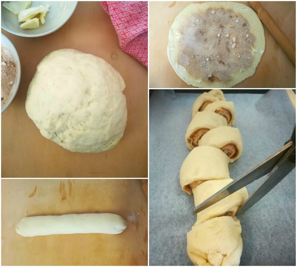 Spread the softened butter at room temperature over the surface of the rectangle. And distribute the sugar, previously mixed with cinnamon.