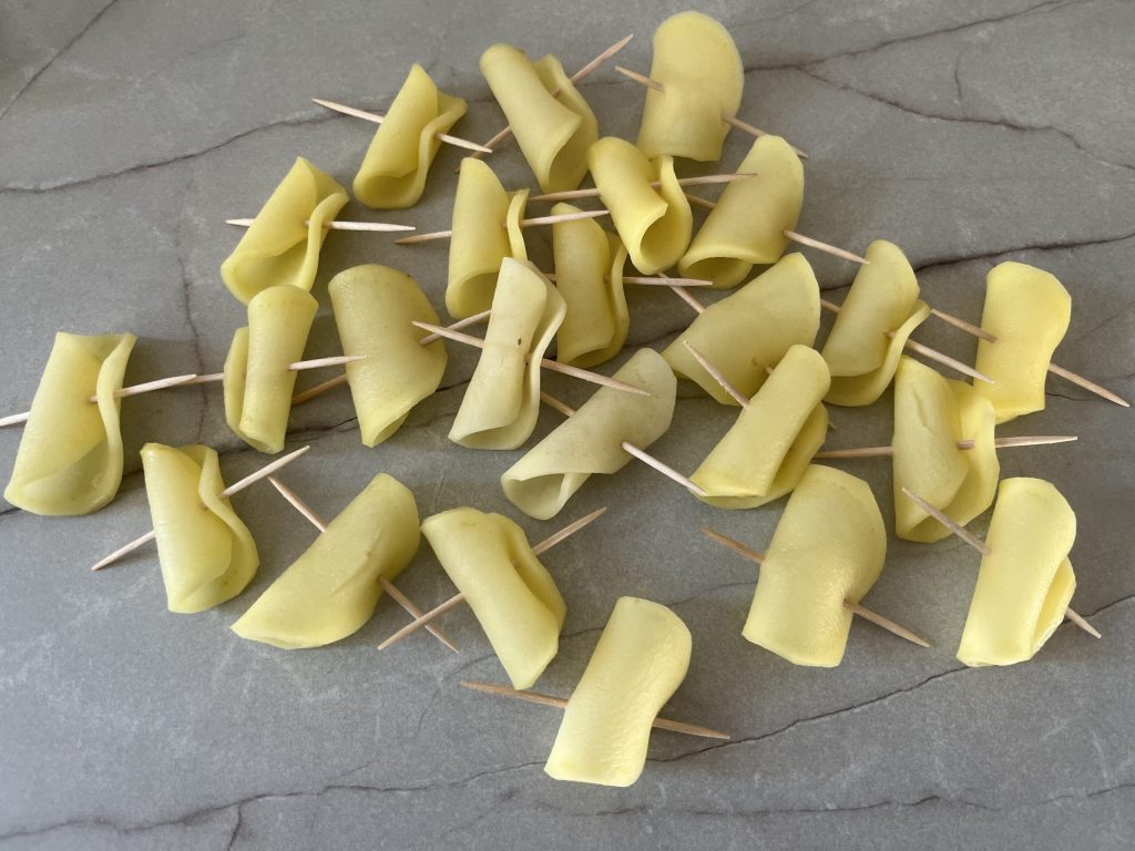 • roll each slice on itself gently and as tightly as possible, being careful not to break them, and secure with a toothpick.