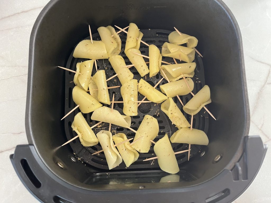 The recipe for air fryer potatoes is very simple, just slice the potatoes, roll them on themselves and secure them with a toothpick, season with a light spray of extra virgin olive oil and oregano and into the air fryer!