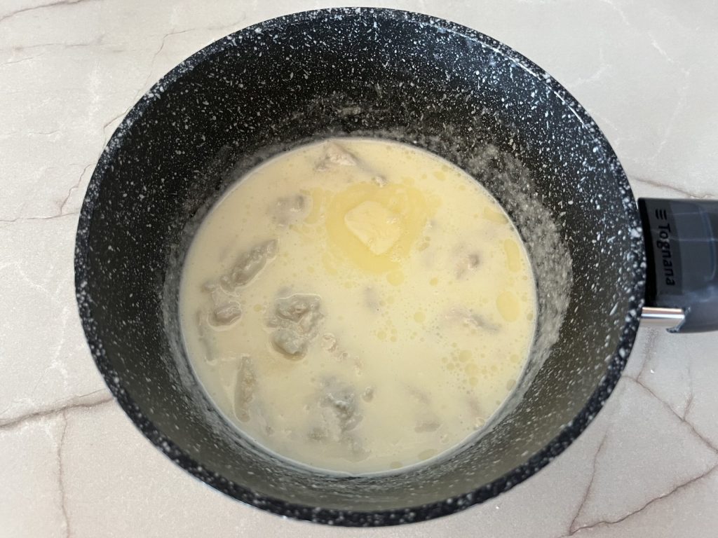 In the meantime, prepare the fondue. In a saucepan, pour the milk and gorgonzola. Cook for 5 minutes, stirring continuously until the gorgonzola completely melts. Finally, add the knob of butter.