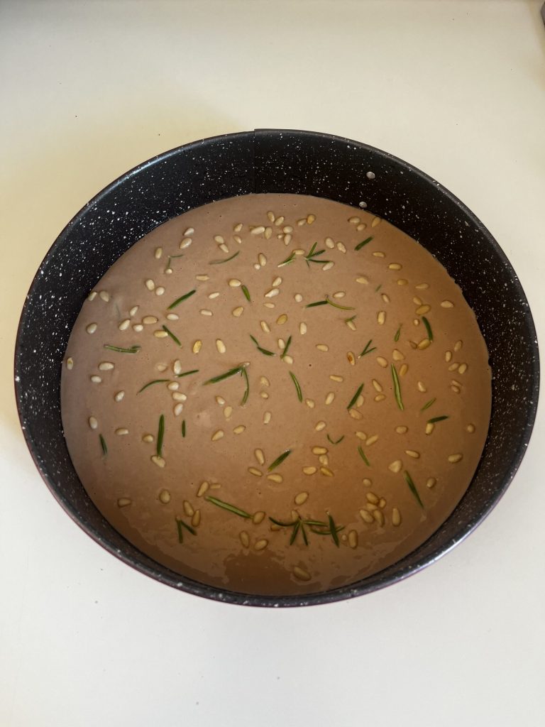 Next, oil a 9.5-inch springform pan and pour the mixture. Sprinkle the surface with well-spaced pine nuts