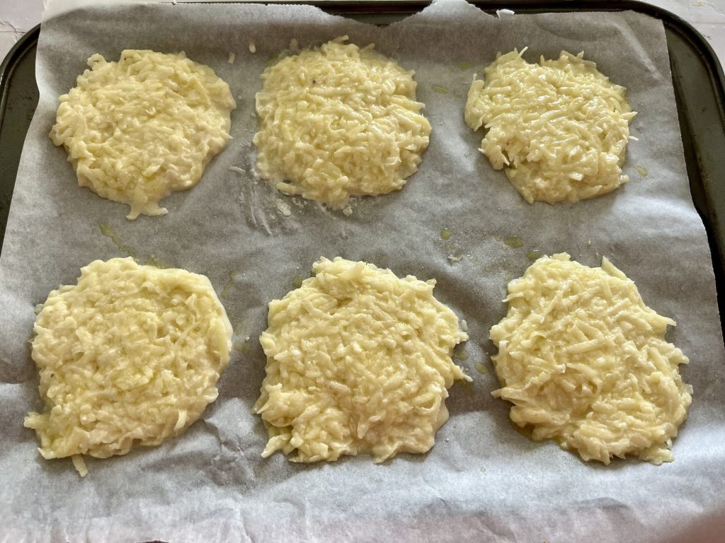 • Take a generous spoonful of the mixture and spread it on a baking tray lined with parchment paper, and with a fork, spread it gently to form pancakes. Do not make them too thin.