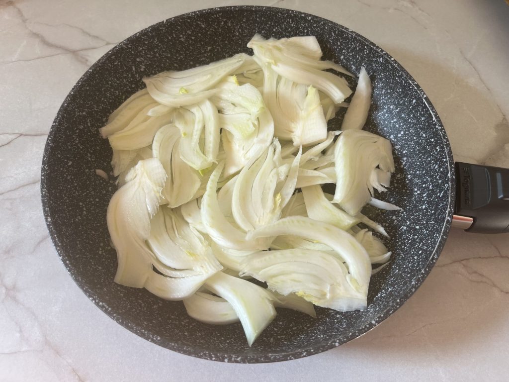 • Grease a pan with a drizzle of extra virgin olive oil, and cook the fennel for about 5-8 minutes, covered and over medium-low heat, turning them to the side.