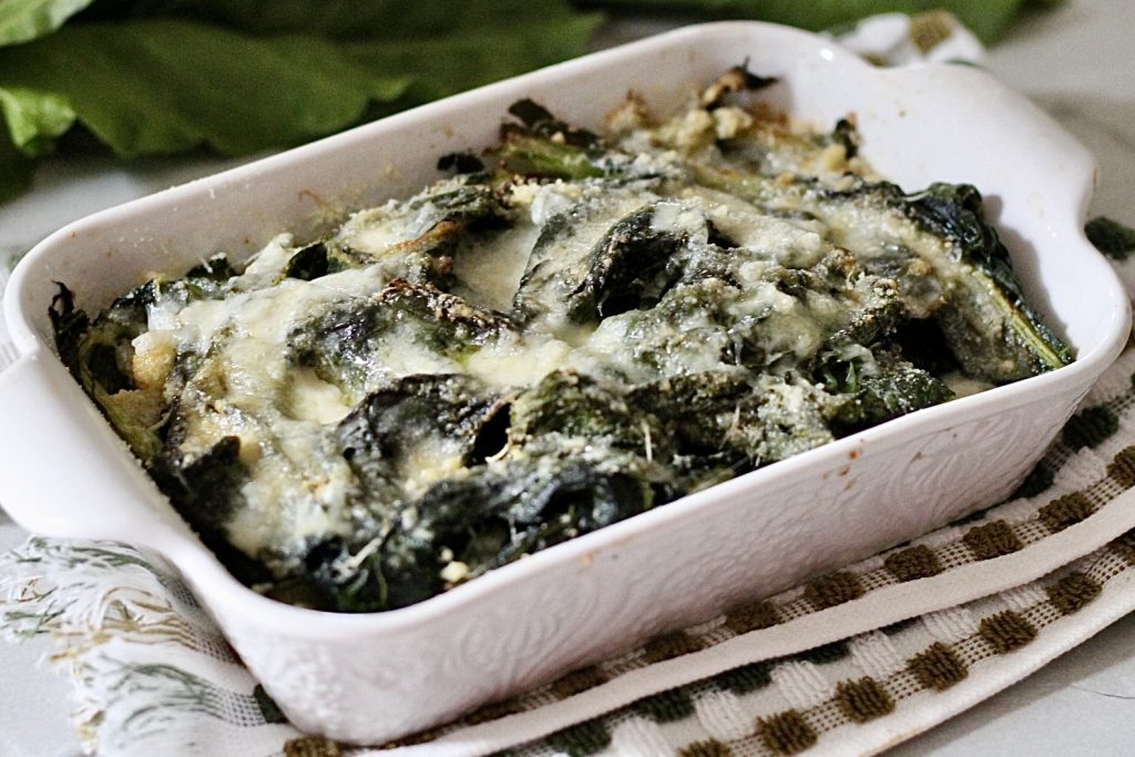 In this oven-baked chard recipe, the green leaves are first blanched and then baked with a delicious Parmesan crust that becomes golden and irresistible during cooking.