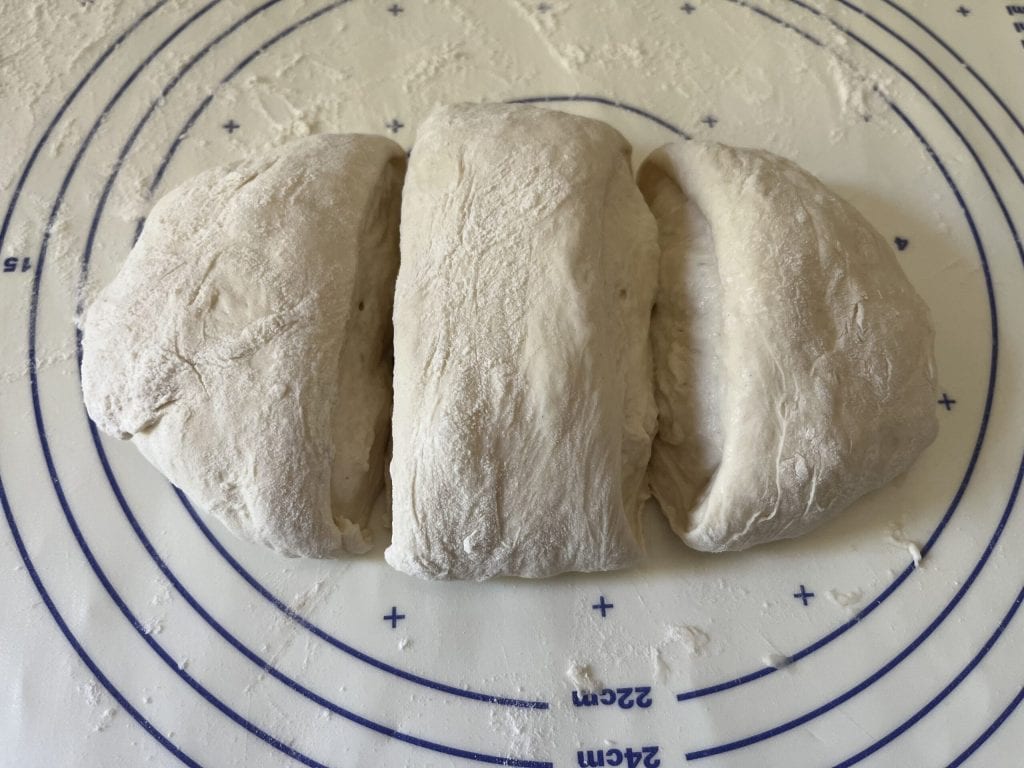 Divide the dough into three equal parts and lengthen each portion by folding it as if you want to wrap it over itself