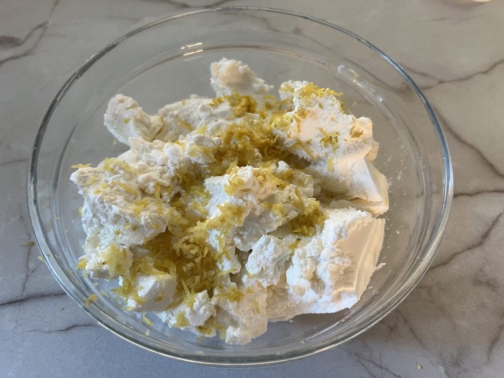• In another bowl, pour the ricotta, the grated rind of one lemon, and the milk. Mix well with a fork or spatula, and add the potato starch. Stir until you get a homogeneous mixture