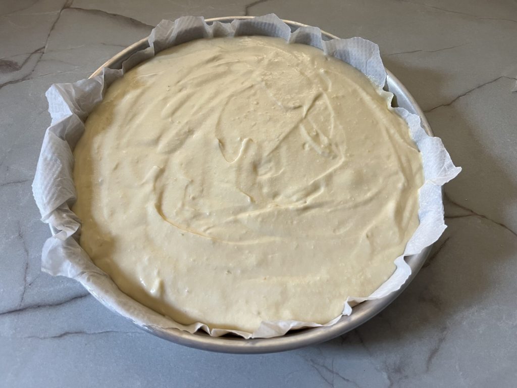 • Line a cake pan d. 20 with parchment paper and pour the mixture. Level it and add the peach slices in a spiral until the entire surface is covered.