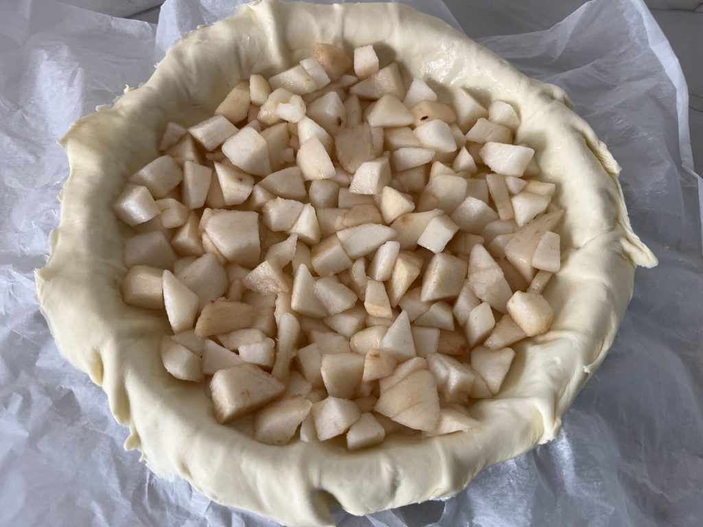 Spread the puff pastry on a round baking pan and place the chopped pears on top.