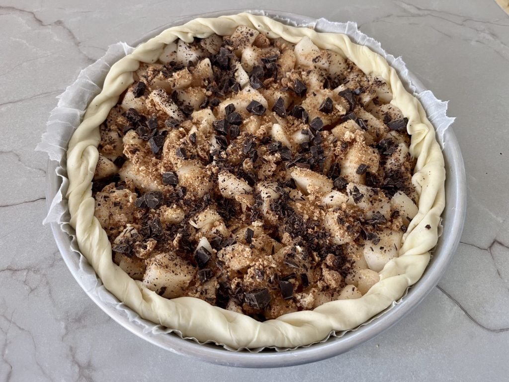 Peel the pears with a peeler making sure to remove all the skin without wasting too much fruit. Cut the pears into small cubes (about 0.4 inches) or thin slices to allow the filling to cook evenly.