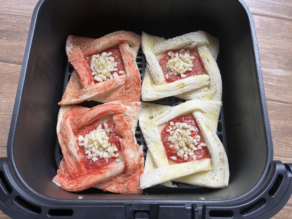 All you need is a few slices of sandwich bread, tomato sauce, and mozzarella, a few minutes in the oven, or an air fryer, and the pinwheel pizzas are ready, crispy and cheesy, to be enjoyed.